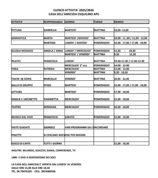 Laboratori artigiani, pittura, informatica, ginnastica posturale, Yoga, Tai Chi; visite culturali; tornei di carte ..